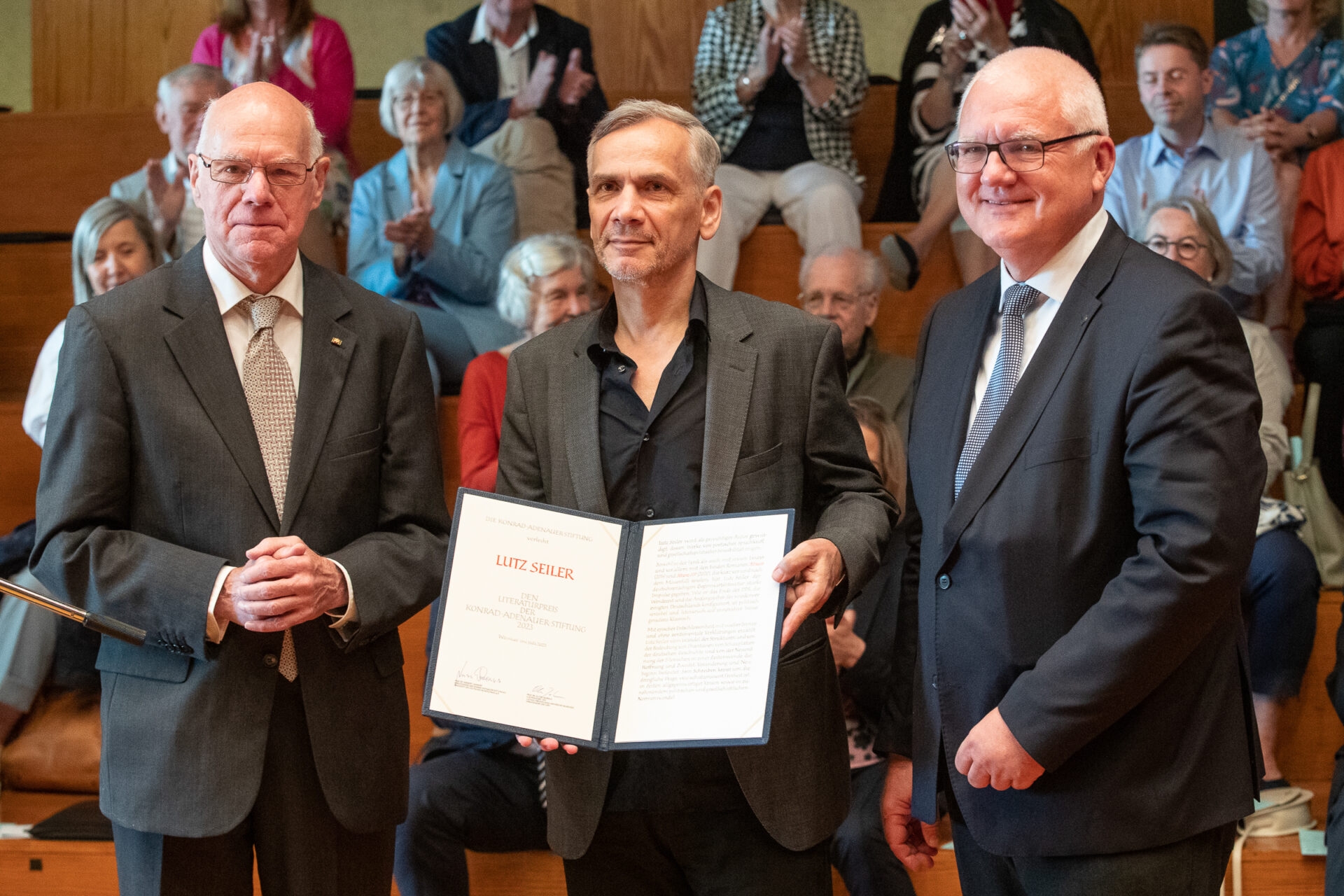Im feierlichen Rahmen überreichten der Stiftungsvorsitzende Prof. Dr. Lammert (li.) und der Vorsitzender der Jury, Prof. Dr. Oliver Jahraus (re.), die Urkunde an Lutz Seiler.