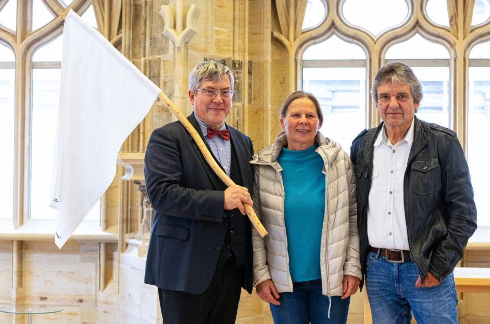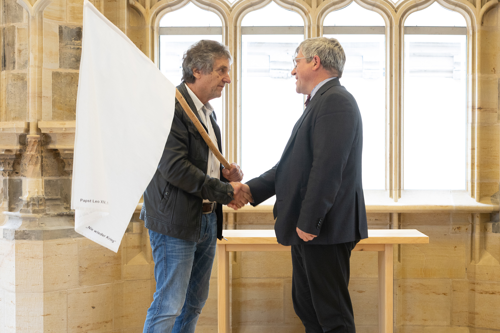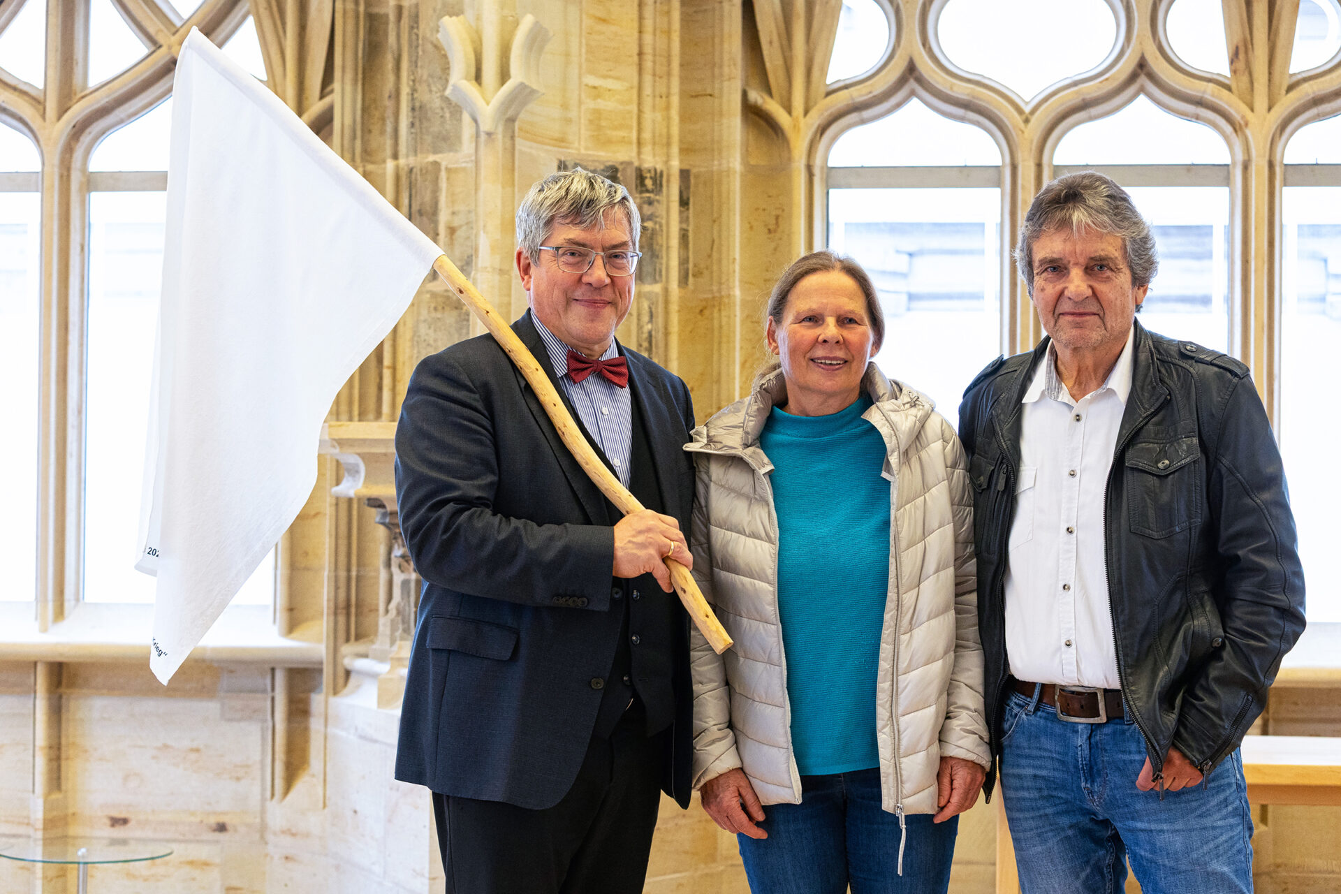 Landesbischof Friedrich Kramer hat in seiner Funktion als Friedensbeauftragter des Rates der EKD eine weiße Friedensfahne im Erfurter Collegium maius, dem Landeskirchenamt der EKM, überreicht bekommen. Die Initiatoren der Aktion, Monika und Johannes Heibel aus Rheinland-Pfalz, wollen damit Kramers engagierten und mutigen Einsatz für den Frieden würdigen. Wir waren dabei, um die Übergabe für Johannes Heibel festzuhalten.