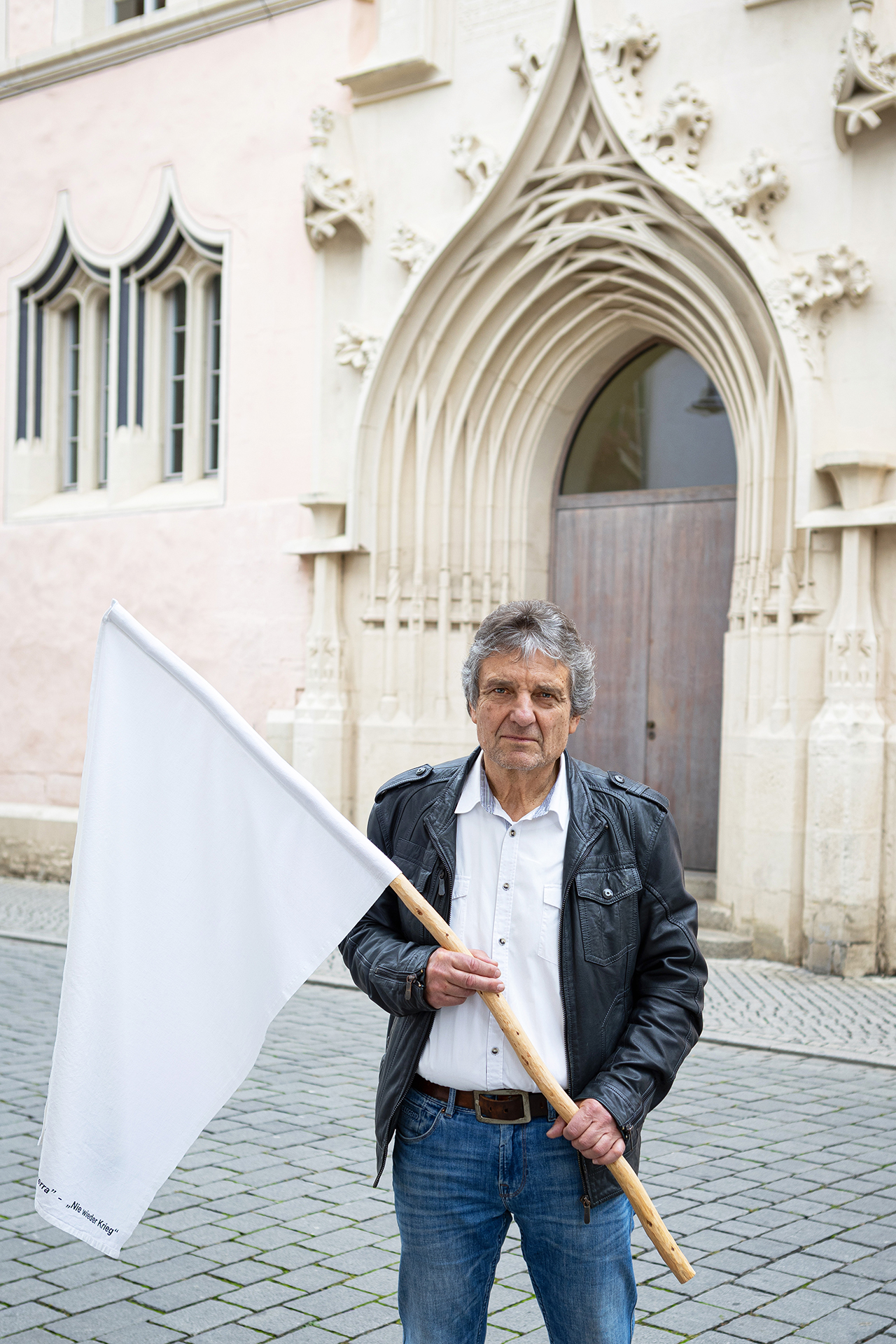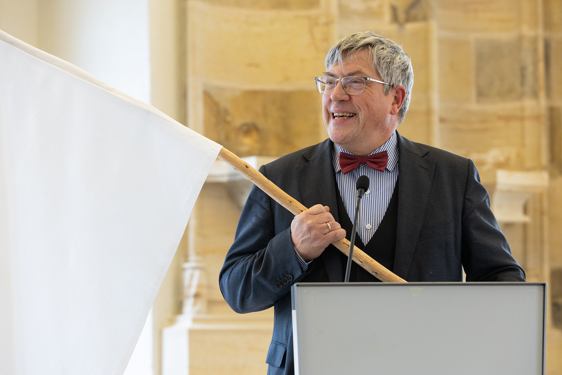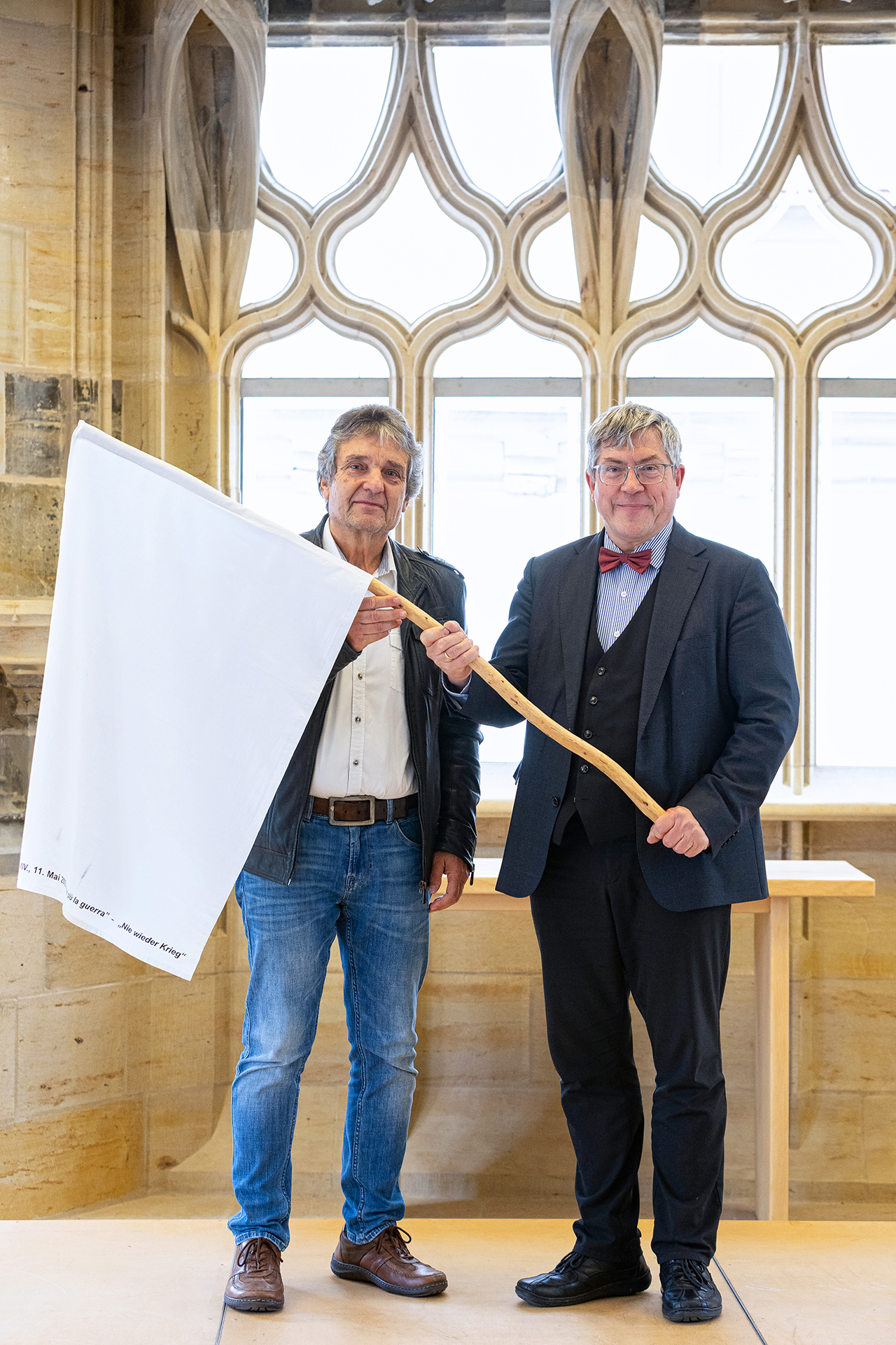 Landesbischof Friedrich Kramer hat in seiner Funktion als Friedensbeauftragter des Rates der EKD eine weiße Friedensfahne im Erfurter Collegium maius, dem Landeskirchenamt der EKM, überreicht bekommen. Die Initiatoren der Aktion, Monika und Johannes Heibel aus Rheinland-Pfalz, wollen damit Kramers engagierten und mutigen Einsatz für den Frieden würdigen. Wir waren dabei, um die Übergabe für Johannes Heibel festzuhalten.